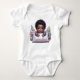 En bedårande afroamerikansk baby pojke iförd en baby bodysuit med en bild av en akryl målning av en liten pojke med sina dyrbara händer liggandes på sin kudde.