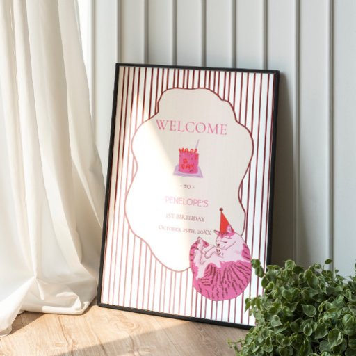Celebrate a purr-fect first birthday with this adorable cat-themed Poster, featuring a sleepy pink kitty in a party hat, a tiny birthday cake, and a sweet striped background with a vintage-style frame.
