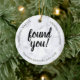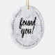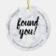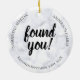 Antagningsåterföreningsdekoration för att hedra minnet av ett möte, återförening eller kontakt. För adopterade som har lokaliserat, kontaktat eller återförenat med biologiska familjemedlemmar i den biologiska familjen som vill ha ett memento, keepsaké eller en symbolisk gåva till med en nyfunnen familj, deklarerar denna dekoration att du har hittat ett stort svart skriptteckensnitt med mallar som gör att du kan registrera datum för återförening eller kontakt och namn eller andra meddelanden. Ornamenten är identisk på båda sidor. Sätt på fingerade vita marmor. En keepy för biologiska mor, far, halva syskon eller andra utökade familjemedlemmar.