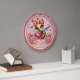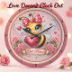 This enchanting circular wall clock features a whimsical 3D digital illustration of an adorable bumblebee with large, expressive blue eyes. The bee wears a pink, heart-patterned bow and holds a shimmering pink heart adorned with smaller red hearts. A cream-colored ribbon banner across the bottom displays the embossed text "Bee Mine" in a delicate red script. The scene is decorated with soft pink roses, green leaves, and a background of shimmering pink light and tiny floating hearts. A thick, solid pink decorative border frames the entire design. The clock face border consists of a light cream ring with black, outlined numbers (1 to 12) and simple black hands centered over the bee.