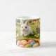 Celebrate Easter in style with this adorable spring-themed mug featuring a cheerful white bunny, fluffy yellow chicks, and colorful Easter eggs nestled in a blooming meadow.