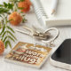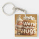 A charming and sweet 3D render or miniature photograph featuring an adorable, fluffy beige felt gnome standing next to a large, textured fabric mug. The gnome has a large white beard, pink cheeks, and a beige knitted hat. The oversized mug is labeled with the message "Warm Holiday Hugs" in white, marshmallow-like letters, and is overflowing with soft white marshmallows. The scene is set against a warm, soft ochre background, emphasizing the cozy, comforting, and whimsical nature of the image.