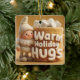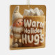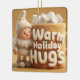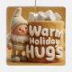 A charming and sweet 3D render or miniature photograph featuring an adorable, fluffy beige felt gnome standing next to a large, textured fabric mug. The gnome has a large white beard, pink cheeks, and a beige knitted hat. The oversized mug is labeled with the message "Warm Holiday Hugs" in white, marshmallow-like letters, and is overflowing with soft white marshmallows. The scene is set against a warm, soft ochre background, emphasizing the cozy, comforting, and whimsical nature of the image.