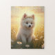 Adorable little, white Spitz puppy sitting peacefully in a field of daisies. Pure cuteness captured in a beautiful spring setting. Perfect for any child!