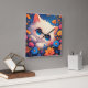 A fluffy white kitten with striking blue eyes peeks through a vibrant bed of orange, pink, and blue flowers. Playful, dreamy mood, perfect for cozy, joyful brand visuals and family themes.