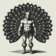 A surreal demon stands in commanding poise: human-bodied, mule-headed, and crowned with a radiant peacock tail. This striking fusion of power and absurdity captures authority, vanity, and otherworldly presence in one bold figure.