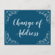 Adressändring stilfull kalligrafi meddelande vykort. Flyttar vykort med elegant virvlande design. Anpassad flytttext; Vi har flyttat! Lägg till din nya adress på baksidan. Klassiska flyttkort för nytt hem eller företagsadress. Chic elegant skript typografi text. Ändra kvantitet för att få det billigaste priset per kort. Snyggt retro vintage utseende.