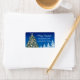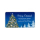 Elegant julkort med lyxmässigt dekorerad skarpsill träd fullt i guld och blå baljor, klockor, trädgårdsmark och båge.
