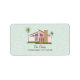 En bild av ett modernt hus i rosa 2000 med handflatan träd över en ljusblå bakgrund med ren vit 2000-årsjubileum inspirerade mönster. Anpassat namn och adress.