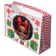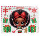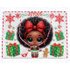 🎄 Afrikansk Flicka i juldräkt 🎁 Cute tecknad African flicka med charming afro puff, stort klart ögon och rosyska kinder. Hon är klädd i en fin juldräkt, komplett med små halvskor och en stor röd hårbun. 🎁 står mitt i en festlig scen med rött snöflingor, grönt presentboxar, en söt mugg av hett choklad och en gingerbrödflicka, (Joyous) text överst i designen, allt mot en pristinvit bakgrund. Denna hjärtebelysande illustration är en perfekt för julklappar och kommer att ge helgdag till dina nära och kära
