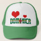 Den berömda Dominica Flagga Hearts Patriotic Truckerkeps med texten "Dominica" på hattens framsida. Inskriptionen infunderas med mönster och färg från Dominicas flagga. Två röda hjärtan, en stor och en liten avslutar utformningen. Hjärtarna är fullt anpassade eller kan tas bort med funktionen "Anpassa det!". Bashatt färg kompletterar utformningen mycket väl. Den här fina hatten är en underbar och unik gåva. © 2023 LänderAvVärlden