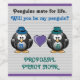 Två vidgande penguiner med violett hjärta och lätt grått rand. Den på den lämnat bär blåfedora, medan den på högerna bär en turkospolarhatt. Byt ut exempeltexten mot din egen ord för en unik gåva. Gör en underbar gåva till ett homosexuellt par, könsneutralt, gender eller gay bröllop-ceremoni, frieri, förlovning, årsdag samt födelse eller adoption i baby.
