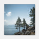 Ett foto av en grupp gräs träd på ett klippt backe över tittar Sjö Tahoe.