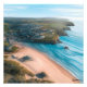 Flygstrand och målning i stan inspirerades av ett flygfoto. Vanligtvis är mina målningar ganska texturerade, men den här bilden inspirerade mig att göra "Soft and Dreamy Perranporth". Utjämnad nästan abstrakt i ställen, digital färgning av Perranporth, Cornwall. Linjer av blått vågar möter klipporna och stranden av tan och rosa vid solnedgången. Husrader och byggnad i staden och på klipporna. Hazy Tunn moln i blå himmel.