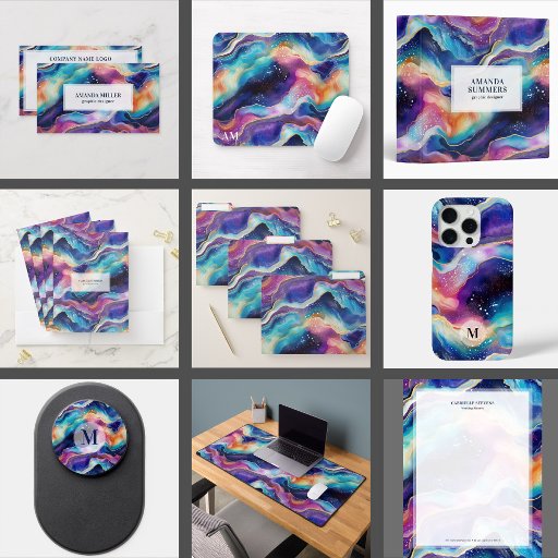 Aestetisk, färgstark regnbåge glitter agate struktur, modern abstrakt design. Anpassadets mörk blått typografi.
