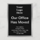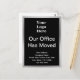 Framsida: En bild av visningen finns överst. Du kan ersätta bilden med logotypen. "Vårt kontor har Flyttat" står i centrum. Fyra linjer av den vita visningen för din nya adress text finns vid grund. Framsidan har en faux (inte folie) silver gräns. Tillbaka: Baksidan har 6 linjer svart visning text. Du kan redigera eller ta bort vilken text som helst om du vill skapa ett anpassningsbar-meddelande till målgruppen.