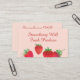 Jordgubbar är Affärskort. Perfekt för småföretagare, restauranger, gård, matlagningslista eller hembagage. Jag har inkluderat textmallar på fram- och baksidan som lätt kan anpassas med dina inställningar för information, teckensnitt och färg. Om du behöver hjälp eller om du gillar vad du ser, men inte ser vad du behöver, kontakta mig för en anpassningsbar. Kontakta kundsupport för Zazzle via https://goo.gl/nCgptf om du vill ha dina beställnings- och leveransproblem