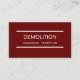 Demolition affärskort med enkel men kraftfull design som visningar ditt yrke på framsidan i svartvitt med två linjer som framhäver och marknadsför ditt namn och all din kontaktinformation på baksidan. Anpassa text, textlayout och bakgrund färg om du vill göra detta till en egen affärskort på båda sidor. Bästa affärskort för en byggentreprenad, rivningsentreprenör eller leasing av byggutrustning.