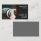 Fotografiskt affärskort med foto av en person som har ett mycket stort kameralins och en mycket stor kamera. Kan användas av fotograf, videofilm, evenemangsplanerare eller studio. Du kan också använda det här som ett bröllop-fotograferat affärskort eller vilken annan typ av fotograf som helst.