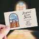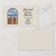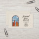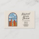 Affärskort med en handritad illustration av ett fönster av nedfläckad-glas med blå himmel, vita moln och rött och gult byggnad: perfekt för konstnär av nedfläckad glas, men även inredingsdesign, florist, konstnär, bröllopsfixaren osv.