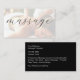 affärskort för trendig av en massageterapi eller en massageterapi designad med en lätt tryckt bild av en kund som får en massage och enkel kontaktlayout som du kan redigera online.