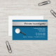 Affärskort för privata utredare i en modern malldesign som innehåller ett förstoringsglas. Bästa affärskort för frågor som rör privatutredare, säkerhet, tillsatta lagar eller privatdetektiver.