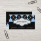Affärskort med svart, vit argyle-trendig, med himmel-blå och vit argyle mönster. Grund är av fast svart färg. En svart och en blå rand skiljer de två delarna åt. Ditt företag/namn är typat på en elegant dammketikett med svart och rosa kontur. Den nutida utformningen, som har en känsla för sig själv, kan användas för många fält, t.ex. insida, frisyr, mode och mycket annat.