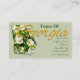 Även om man ibland kallade "Empire state i syd" är Georgiens officiell smeknamn "Persikostaten". Ingen . Georgien är den största producenten av jordnötter, persikor och pekaner. Tjerokee Ro, som är så vacker och ömtålig, har en ledsen saga. En tragisk händelse 1838 då tusentals Tjerokee tvingades ut ur Georgien och andra länder öster i Mississippifloden. Väg som tagits av de inhemska amerikanerna har kallats "Tårar-leden" på grund av de tårar som skövlades av kvinnorna i Cherokee på resan och på grund av det antal inhemska amerikaner som dog på vägen. De säger att hövdarna bad om ett tecken till ge som deras kvinnor hoppas på. Det sägs att där ett tårfall föll blåste ett Cherokee Ro. Blommorna fortsätter att blomma längs väg i dag. Georgien blev den fjärde staten 1788. Som en av våra "äldre" stater är det förvånande att staten sång, "Georgia on My Mind" antogs 1979 och officiell statlig flagga endast data 2003. För all rikens historia, bra och dåligt är Georgien hem för en av de mest contemporary städerna i land: Atlanta. Atlanta är också Coca-Colas födelseort. Den här fina designen betalar hyllning till detta vackra tillstånd. Statens kontur fylls med de vackra vita blommorna från Tjerokee Ro. Detta är upplagt med gult guld "Georgia". Dessa vackra, fullt anpassningsbara affärskort är ett utmärkt val för Georgiens turistguider, Georgiens resebyråer eller något företag som har med Georgiens turism att göra.