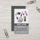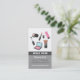 En snyggt, ett affärskort med digitalillustration av olika makeup-tillbehör och essentialer som läppstift, mascara, en ansikte-pulverpensel och palettbox. Perfekt för konstnärer, stilister och konstnärer i mode och kosmetikaindustrin. Anpassa enkelt dina kontaktuppgifter.