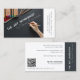 Affärskortet Art Workshop White Artist visar en konstaktivitet på ett svart yta med konstföremål. Den har en ren typografi, med ett vitt vinklat företag namn i mitten och företagstjänster på framsidan. Affären namn längst bak är på lodrät för svarta band. Affärsinformationen finns också i en vit bakgrund plus QR-koden. Hela konceptet är contemporary och lekfull gör det spännande för ett konstnärligt affärskort.