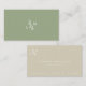 Det här enkla och elegant affärskortet har ett botaniskt monogram med löv i vitt på lagerbakgrunden i grönten. Baksidan har khaki beige-bakgrund med monogrammet. Anpassa den efter dina behov. Perfekt för florister, blommigt designers, aromatterapeuter, massageterapeuter, butiques, spas, trädgårdsmästare, designers i insida, grafiska designer, författare, evenemangsplanerare, konsulter och alla gröntar, miljörelaterade och hållbara professioneller inom näringslivet. Du hittar matchande produkter i min butik.