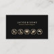 Affärskortet för hemreparationer och allmänna reparationer har en svart bakgrund i jet. Fem guld-ikoner för hemreparationer visas på kortets nedre halva, där namn och tagg eller text visas med fet stil på den övre halvan. Din kontaktinformation visas på baksidan av kortet. De små ikonerna skapar en mycket imponerande professionell.