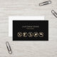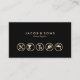 Affärskortet för hemreparationer har en svart bakgrund i jet. Fem guld-ikoner för hemreparationer visas på kortets nedre halva, där namn och tagg eller text visas med fet stil på den övre halvan. Din kontaktinformation visas på baksidan av kortet. De små ikonerna skapar en mycket imponerande professionell.