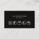 Affärskortet för hemreparationer har en svart bakgrund i jet. Fem guld-ikoner för hemreparationer visas på kortets nedre halva, där namn och tagg eller text visas med fet stil på den övre halvan. Din kontaktinformation visas på baksidan av kortet. De små ikonerna skapar en mycket imponerande professionell.