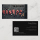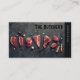Affärskortet Kött Cuts Butcher har visningen att namnteckning slaktarens styckningsdelar i kött med knivar och gaffel på betong i bord. Affärstjänsten namn och tjänsten eller en tagline finns i det övre hörnet av högerna. Den svarta remsan på högerna belyser den tjänst som kompletterar den svarta färg i namn och baksidan av färg, som skapar en minimalistisk och modern utformning.