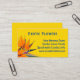 Bright, blommigt affärskort med paradisblommor. Gult kort med exotiska, orange blommor i hörnet. Anpassa mörk blått text i två ställe för att marknadsföra ett företag eller ett yrke. Rubrik eller namn överst med upp till fem linjer tryckt text som är justerad till högerna. Omvänd är solid gult.