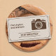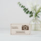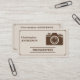 En fotograferares affärskort i vintage (beige och brunt färg) med en kameraikon, stiliserad kontur och detaljerad information på baksidan. Det skulle kunna vara lämpligt för alla typer av fotoaktiviteter: bröllop, mat och matvaror, porträtt, mode, nyfödda, kommersiella osv.