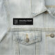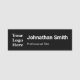Det svarta namn bricka har två linjer vit text. Du kan redigera texten för att visa medarbetarens namn och befattning. En visning visas bredvid texten. Du kan ersätta bilden med företagets logotyp.