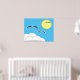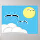 Tre måsar svävar i en klarblå himmel. I det nedre vänstra hörnet syns fluffiga vita moln med grå skuggor. Mindre/avlägsnare mås flyger framför solens gula klot.