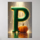 Denna strålande bokstav "P" -tryck firar höstens hjärta med gyllene ljus, gnistrande charm och en perfekt pumpa som följeslagare. En rik grön glitterstrukturerad versal P står hög under en varm spotlight, dess djupa skimrande omgivet av glödande stjärnstoft. Inkilad bredvid sitter en fyllig orange pumpa, vars släta kurvor och krulliga stjälk badar i samma magiska sken.