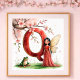 Standing serenely beside the letter is a charming fairy with long, glossy black hair and rosy cheeks. She wears a beautiful dress in warm coral-red tones with a sparkly short-sleeved bodice featuring golden embroidered details and a flowing skirt adorned with intricate golden swirl patterns. Her large, translucent wings feature peachy-gold coloring with elegant spiral designs creating a butterfly-like appearance. The fairy's gentle smile and natural, relaxed posture create an approachable, friendly atmosphere.