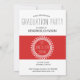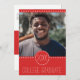 Inbjudan till Photo Studenten med ett lycklig-leende högskola student och en djärv röd emblem och banderoll. Ett glatt och inbjudande av det moderna stil med typsnitt av trendiget.Anpassa på kortets baksida med information om datum, tid och plats.