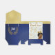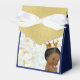 Royalet African Prince Baby Shower Favor tält box med royal blue , guld och marmor front med en berömvärd etnisk prins med guld krona. Baksidan har guld vapensköld runt personlig initialer i vitt.