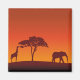 Afrikansk safari-landskapets bakgrund med silhuetter av en giraff, en träd och en elefant mot solnedgången i orange och röda färg.
