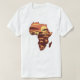 En stiliserad silhuett på den afrikanska kontinenten fylld med lagrade scener av vilda djur och natur. Bilden har symboler för afrikanska djur som lejon, giraffer, rinos, elefanter och antelopar, som ställs mot bakgrund av acacia träd och ett sol. De varma, övertonande tonerna av orange, rött och brunt framkallar färg från en afrikansk savanna under solnedgången. Sammansättningen blandar på ett bra sätt Afrikans form med rikens biologiska mångfald och naturlandskap.