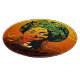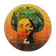 Min design har en stiliserad porträtt av en vacker afrikansk kvinna som bär ett färgstarkt huvudskrot. Huvudet är försett med grönt och gult löv mönster. Hennes ansikte är fyllt med en solnedlagd silhuett, komplett med fåglar som flyger över himmel och ett landskap med träd. Hon bär stora, ornerade örhängen och ett belagt halsband. Original Pop Art Stil Vector Illustration Copyright BluedarkArt ChameleonArt.