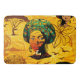 Min design har en stiliserad porträtt av en vacker afrikansk kvinna som bär ett färgstarkt huvudskrot. Huvudet är försett med grönt och gult löv mönster. Hennes ansikte är fyllt med en solnedlagd silhuett, komplett med fåglar som flyger över himmel och ett landskap med träd. Hon bär stora, ornerade örhängen och ett belagt halsband. Original Pop Art Stil Vector Illustration Copyright BluedarkArt ChameleonArt.