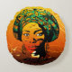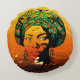 Min design har en stiliserad porträtt av en vacker afrikansk kvinna som bär ett färgstarkt huvudskrot. Huvudet är försett med grönt och gult löv mönster. Hennes ansikte är fyllt med en solnedlagd silhuett, komplett med fåglar som flyger över himmel och ett landskap med träd. Hon bär stora, ornerade örhängen och ett belagt halsband. Original Pop Art Stil Vector Illustration Copyright BluedarkArt ChameleonArt.
