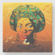 Min design har en stiliserad porträtt av en vacker afrikansk kvinna som bär ett färgstarkt huvudskrot. Huvudet är försett med grönt och gult löv mönster. Hennes ansikte är fyllt med en solnedlagd silhuett, komplett med fåglar som flyger över himmel och ett landskap med träd. Hon bär stora, ornerade örhängen och ett belagt halsband. Original Pop Art Stil Vector Illustration Copyright BluedarkArt ChameleonArt.