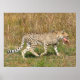 Profil African Cheetah (Acinonyx jubatus) som går på gräs med kött i munnen